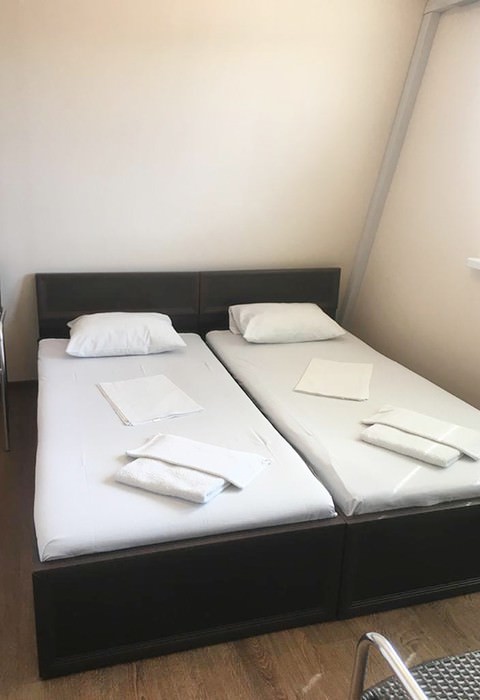 Площадь номера - 13-15 кв.м. 1 комната. 2 осн. места. холодильник на кухне. В номере: телевизор; кондиционер; душ; туалет; 1-спальные кровати. 1 доп. место: Еврораскладушка - только для детей до 7 лет.
